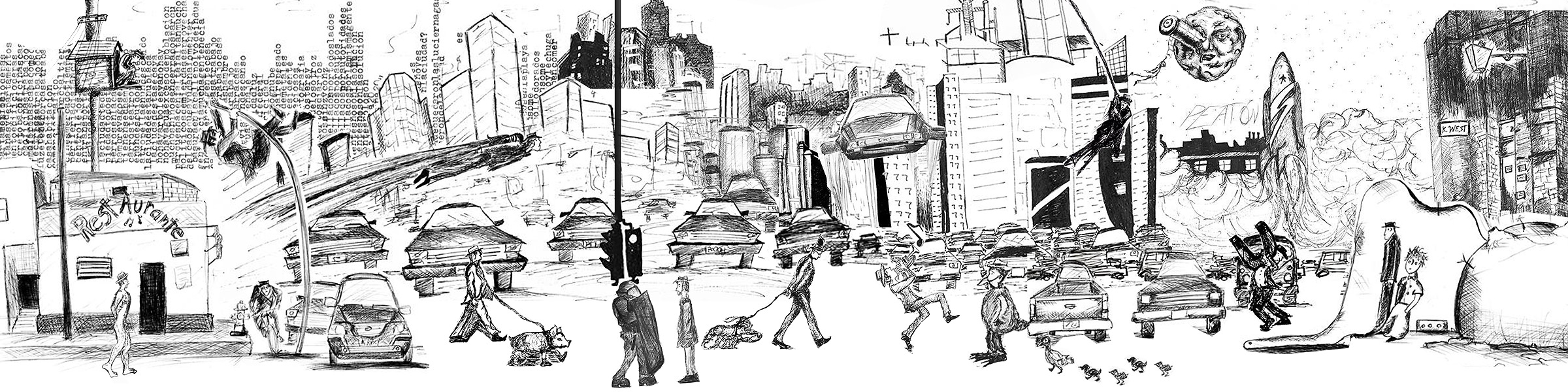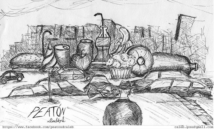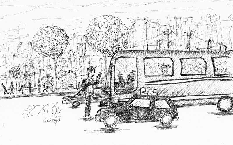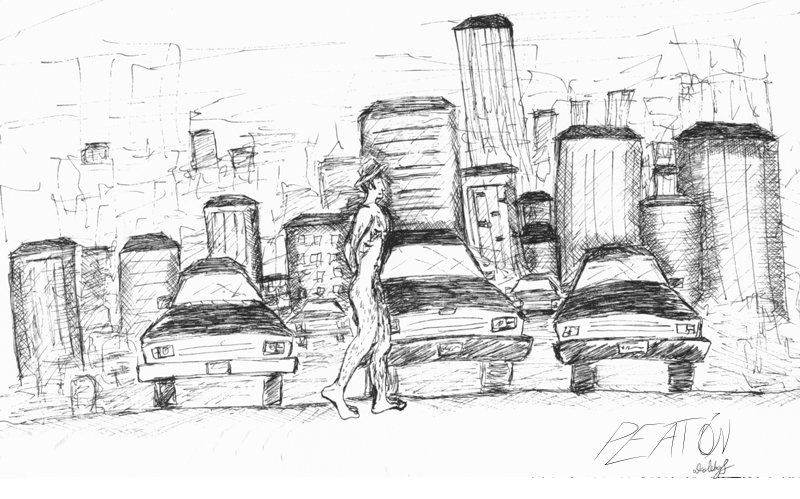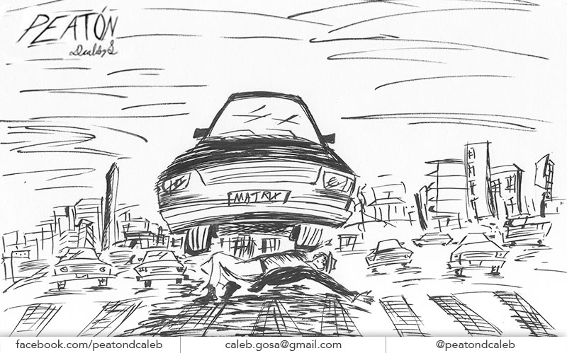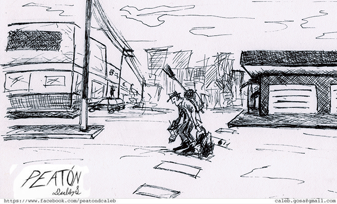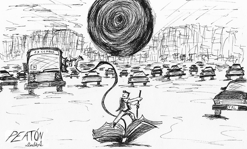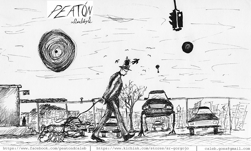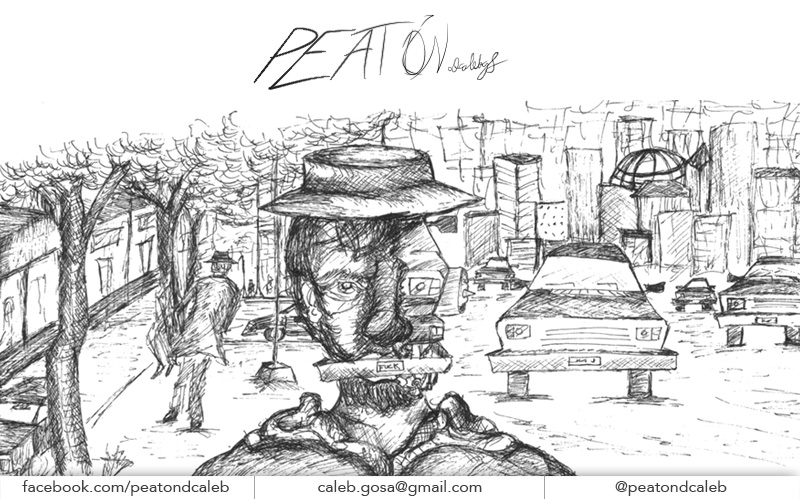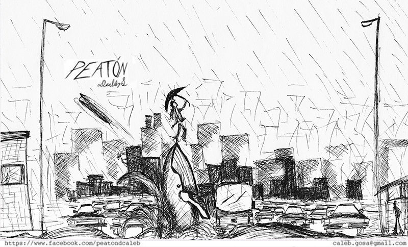Es un proyecto que inicié en mayo del 2012, en el que se ilustra a través del dibujo la forma en que me percibo como caminante dentro de una ciudad como Monterrey, donde las calles están construidas para el automóvil. A veces de forma fantástica, a veces más cercana a la realidad, aprovechando el lenguaje de la tira cómica y tomando libremente recursos del cine, la literatura y de mis recorridos por la ciudad,. Con más de 150 ilustraciones, Peatón es un proyecto que continúo desarrollando.